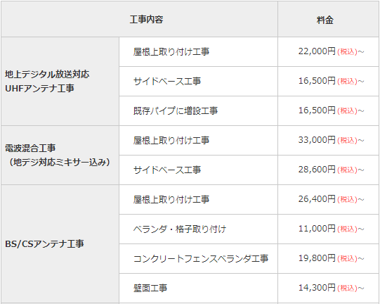 アンテナ工事では表示の料金以外にも費用が発生する可能性があります。
