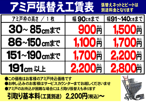 ダイシンでは上記料金で網戸張替えをしてもらえます。