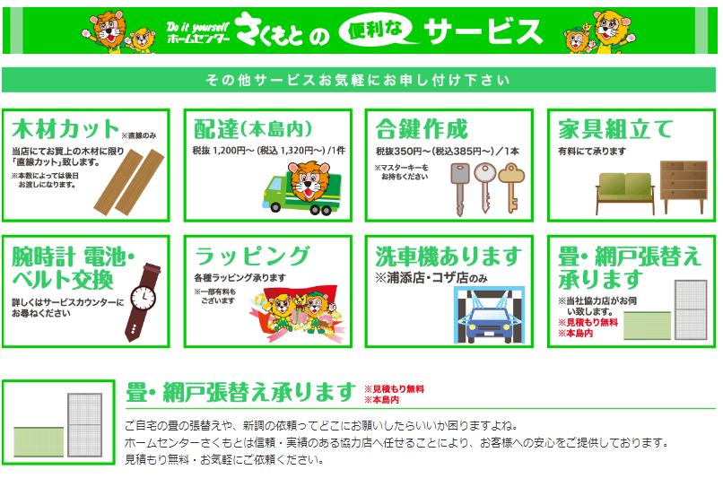 ホームセンターさくもとは網戸の張替え以外にも家のお困りごとに色んなサービスを提供してくれます。