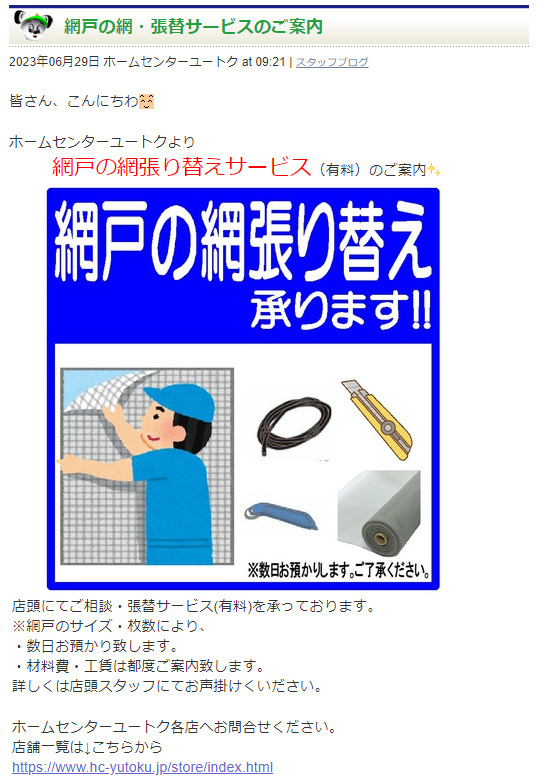 よく利用しているホームセンターユートクで網戸張り替えをしてもらえるなら、サクッと悩みが解消できますね。