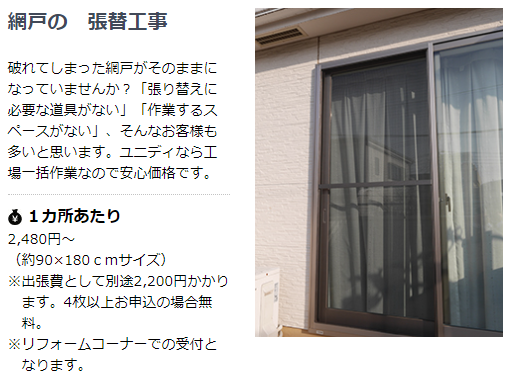 ユニディでは自宅に出張して網戸張替えをしてもらえるようです。